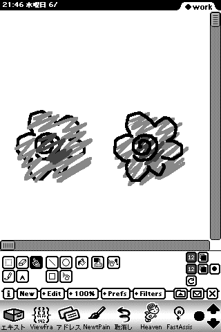 右の図は黒で描いた下絵の上に、標準のペンと自作のペンでそれぞれトーンを塗ったときの違いを表わしています。右側の絵の下絵の線が消えずに残っていることに注目してください。
