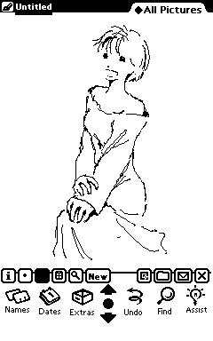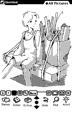 完成年月日:1998/9/30 使用ハードウェア:Newton MessagePad 130 使用ソフトウェア:NewtPaint 1.5a1 作成所要時間:1時間以内 説明: 某TVゲームの攻略本の1コマをスケッチしたもの。人物のポーズとカメラアングル以外まったく似ていません。 このスケッチを完成させるためにはあと、どのくらいかかるでしょうか。他意のない笑顔が描けたのでもう、このままよしとしました。 |