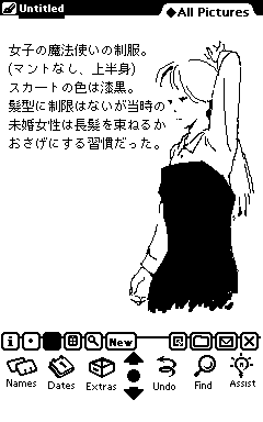 完成年月日:1998/10/4 使用ハードウェア:Newton MessagePad 130 使用ソフトウェア:NewtPaint 1.5a1 作成所要時間:1時間以内 説明: 私は物語の設定を考えるときにメモを描きます。そのようなメモもスケッチと同様にMessagePadの中に残すようにしていて、全て私の記録になります。 左のスケッチについて。いやいやな表情が個人的に気に入っています。 |