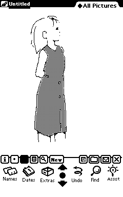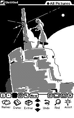 完成年月日:1998/10/26 使用ハードウェア:Newton MessagePad 130 使用ソフトウェア:NewtPaint 1.5a1 作成所要時間:3時間以内 説明: 立っているシルエットの描写から始めて、あとは成り行きまかせに描きあげたものです。 |