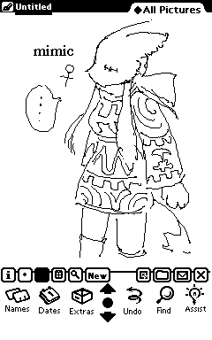 完成年月日:1998/11/6 使用ハードウェア:Newton MessagePad 130 使用ソフトウェア:NewtPaint 1.5a1 作成所要時間:1時間以内 説明: PlayStationのゲーム「FinalFantasyTactics」に登場するものまね師(女)です。なにがなんだかわからない格好をしていると、プレイしながらずっと思っていました。スケッチしてみて初めて気がついたのですが、これってキツネのコスチュームなのでした。気づくまで、なぜお尻に布袋を吊しているのか理解できませんでした。 |