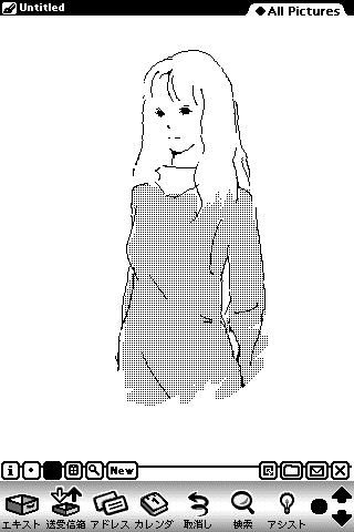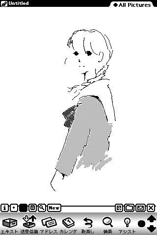 完成年月日:1998/12/10 使用ハードウェア:Newton MessagePad 2100J 使用ソフトウェア:NewtPaint 1.5a1 作成所要時間:3時間以内 説明: MessagePad2100Jで描いた最初のスケッチです。某コミックの表紙をスケッチしました。グレイトーンで描けるHexPaintも本体といっしょに購入しましたが、自前のプラグインツールが完成するまで今までどおりNewtPaintで仕上げることにしました。 |